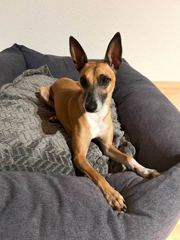 Ansa (17.01.2021) ist eine lebhaft verspielte und anhängliche Hündin mit sehr viel freudiger Lebensenergie. Sie liebt es zu rennen, da kommt der Windhund in ihr durch und sie apportiert leidenschaftlich gut und gerne. Ansa ist mit ihren neun Kilos eine zarte Hündin, welche ein liebevolles Umfeld sucht. Im Alltag benötigt sie Ruhe, Struktur und eine faire Führung. Bei Hundebegegnungen oder sonstigen unerwarteten Situationen springt sie bellend in die Leine und pöbelt. Daher trägt sie draussen einen Maulkorb. Zuhause ist sie eine wunderbare ruhige Lady, welche gerne im Bett, in kuscheligen Decken eingepackt und am besten nahe an ihrem Menschen schläft. Eine Kuschelmaus eben.
