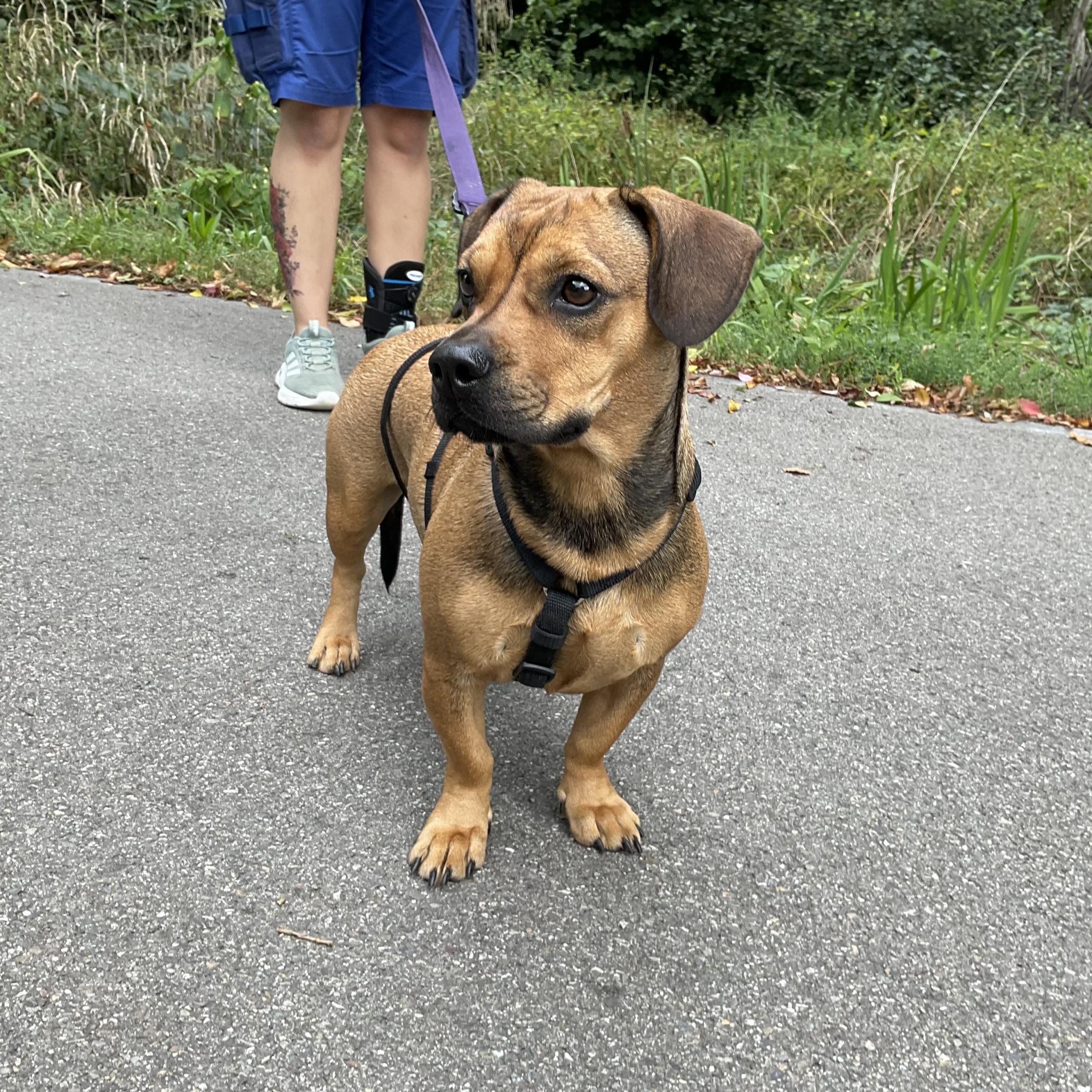 Gitti läuft bereits gut an der Leine , sie ist draussen sehr neugierig, bei neuen Sachen aber auch etwas vorsichtig. sie kann manchmal fremde Menschen. Neuen Menschen gegenüber ist sie im ersten Moment etwas zurückhaltend, taut aber schnell auf. In Gitti schummert ein grosser Jäger, dies bedeutet das sie zukünftig nicht unbedingt ab der Leine gelassen werden kann. Natürlich muss die Aktivität ihren kurzen Beinen angepasst werden.