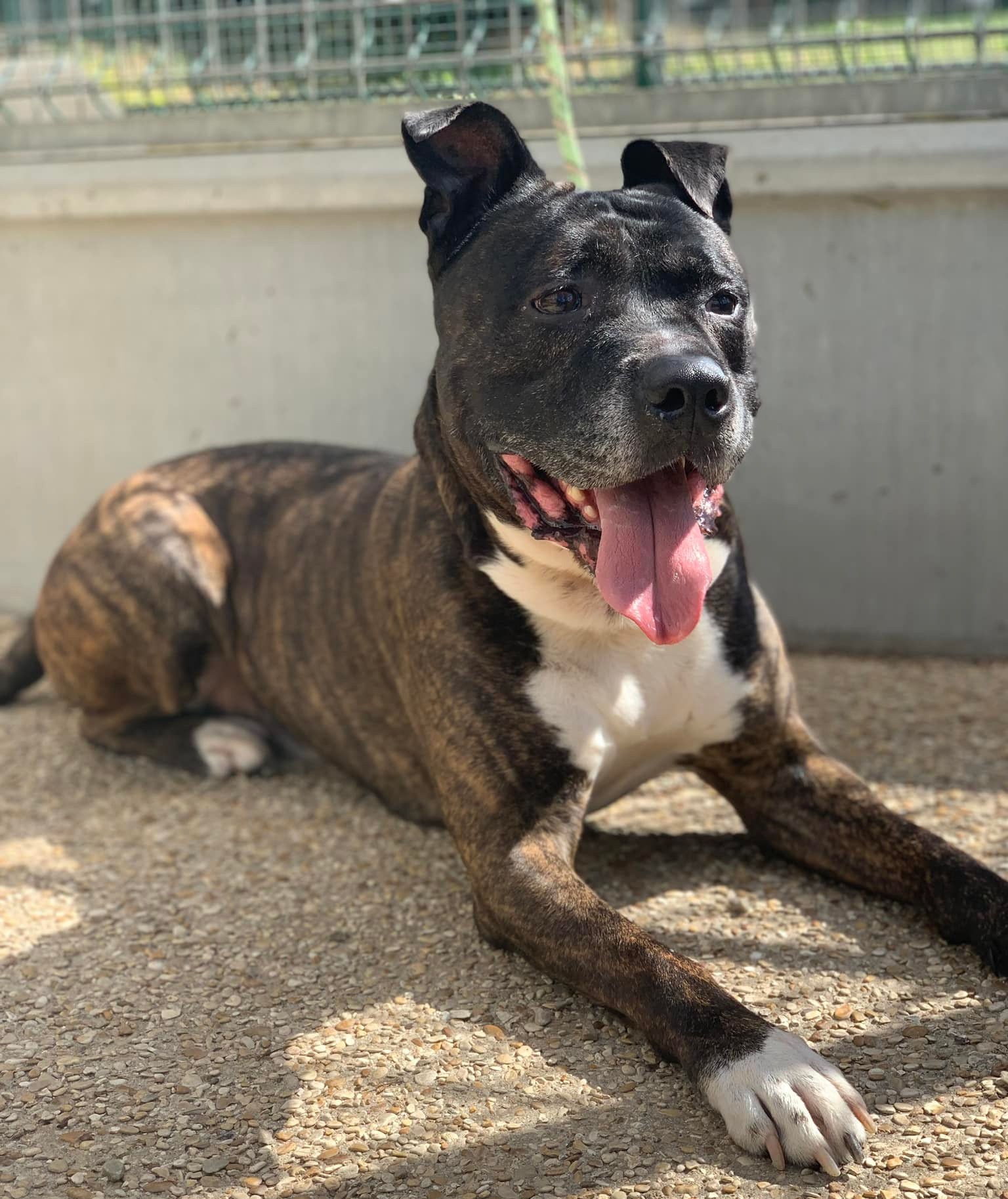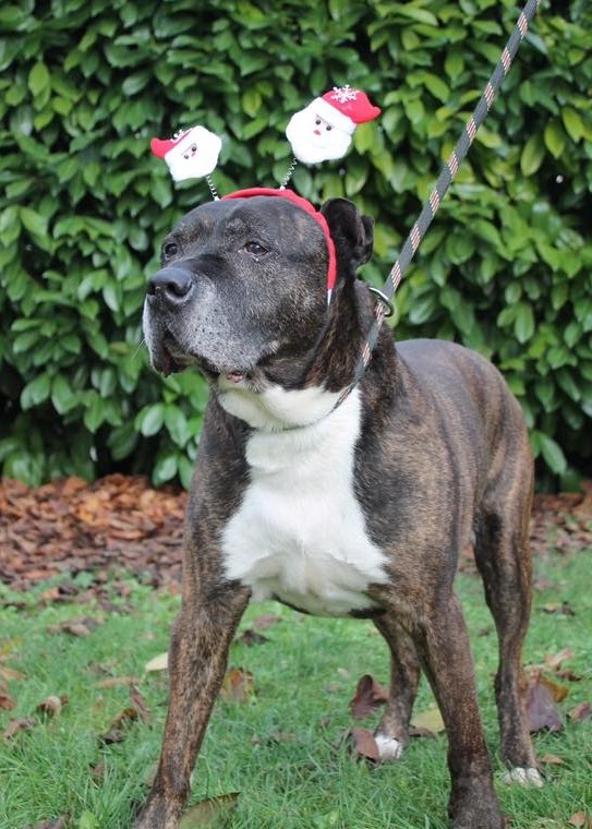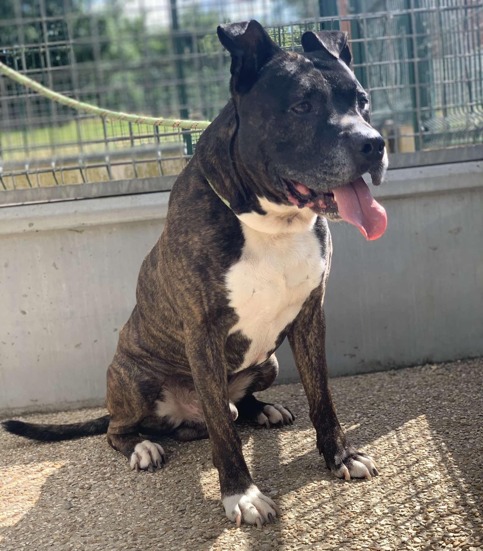 Inzwischen ist er ein echter Opi von 12 Jahren. Vom Volumen kommt der Koloss eher nach dem Cane Corso, der in ihm steckt. Als Rasse hat der Tierarzt Cane-Corso-Staffmix eingetragen.