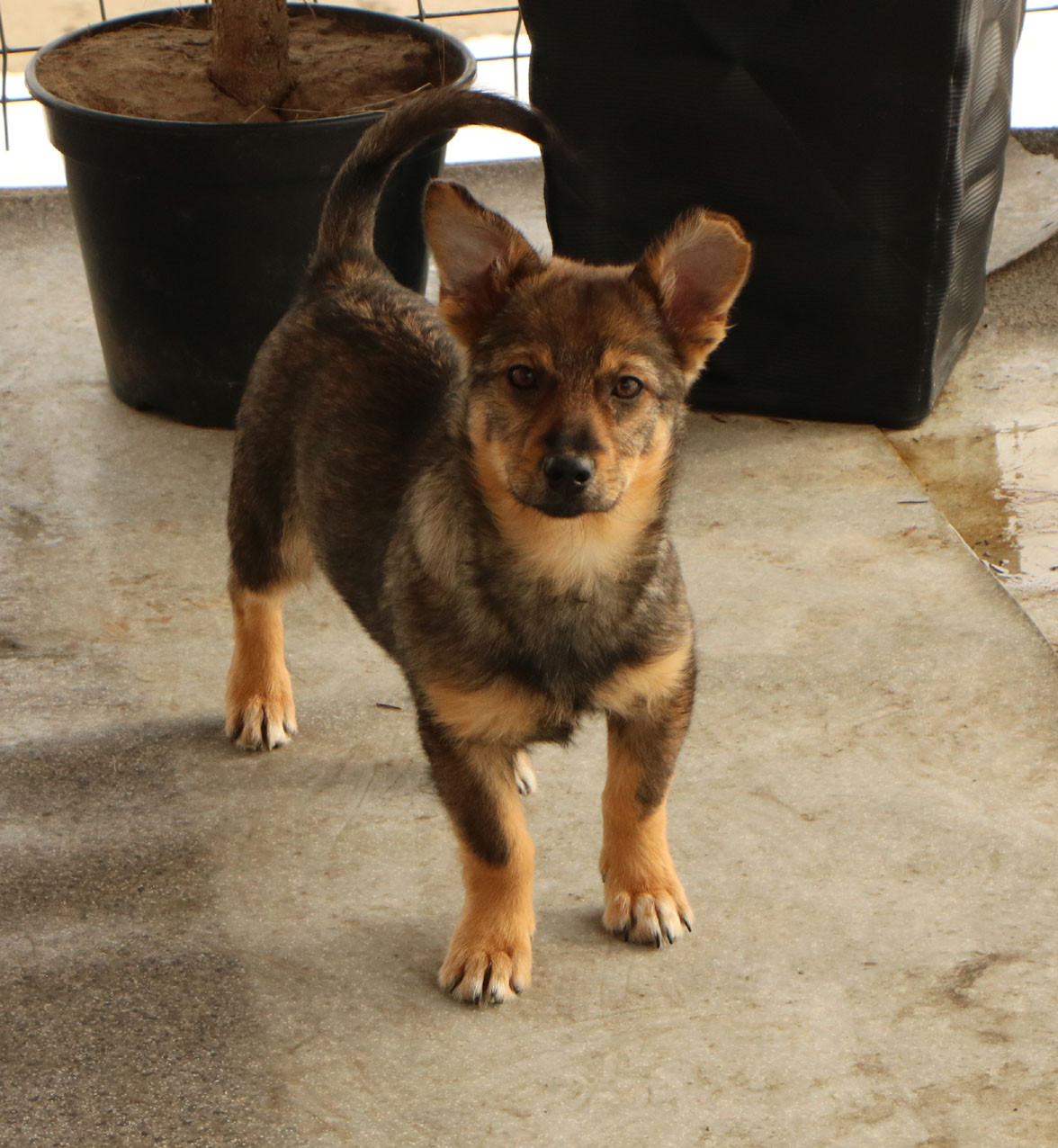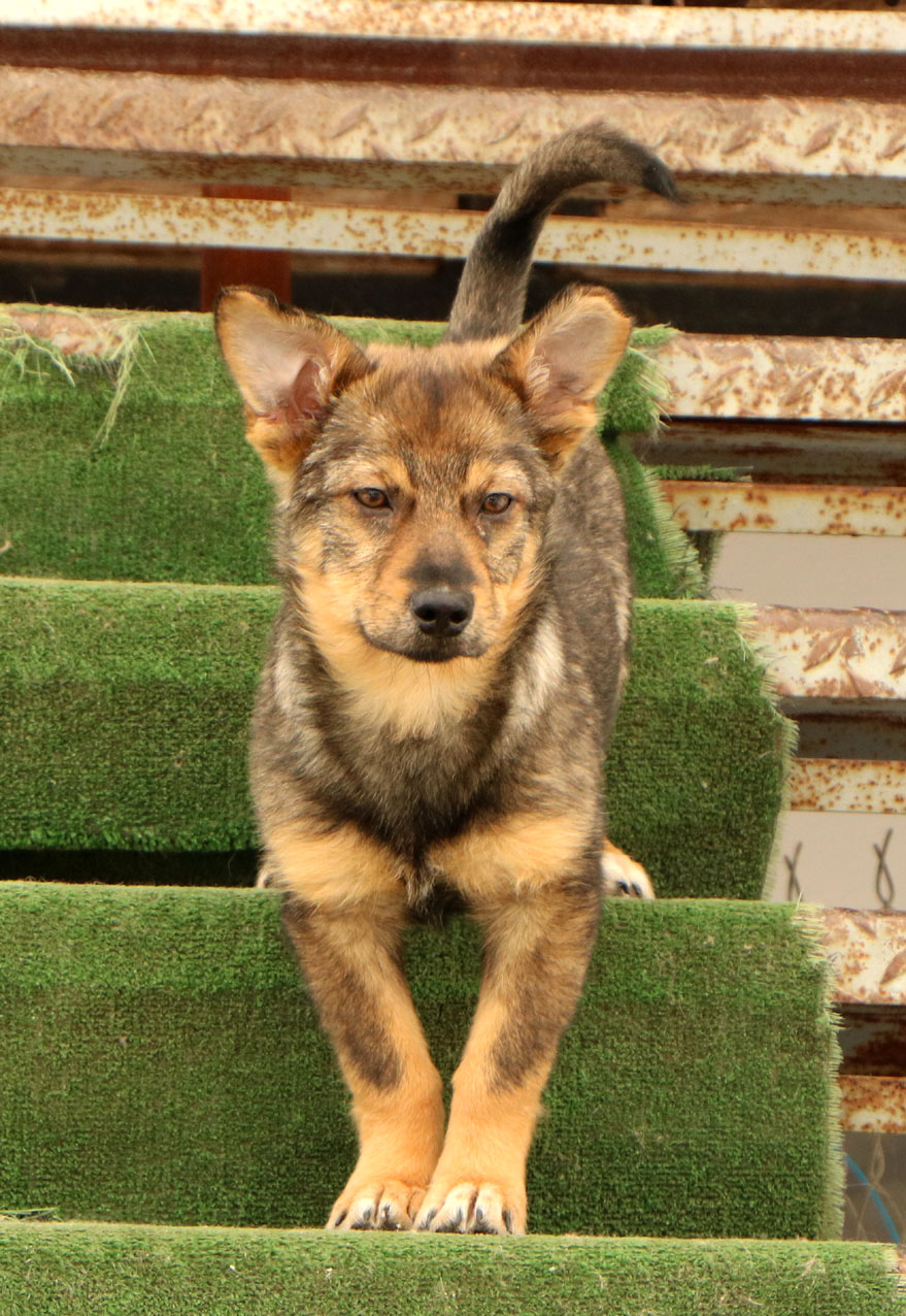 Mit den Hunden in ihrer Gruppe versteht sie sich sehr gut, manchmal möchte sie sogar den Ton angeben. Da wir ihre Eltern nicht kennen, können wir über ihre Grösse nur spekulieren; wir denken, dass sie eher eine kleine Hündin sein wird.