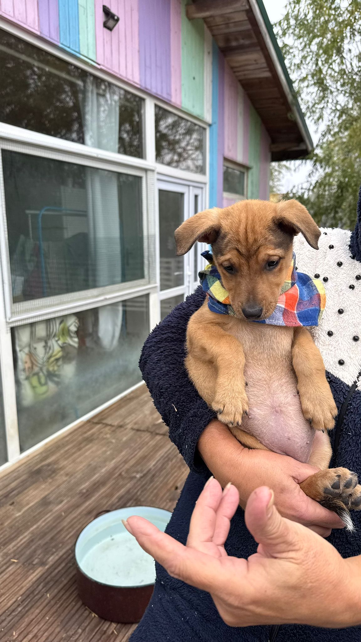 Lulu wurde auf einem Bauernhof bei regnerischem Wetter entdeckt zusammen mit Minkie einem anderen Welpen. Die beiden wurden gerettet und in unser Tierheim in Rumänien gebracht.