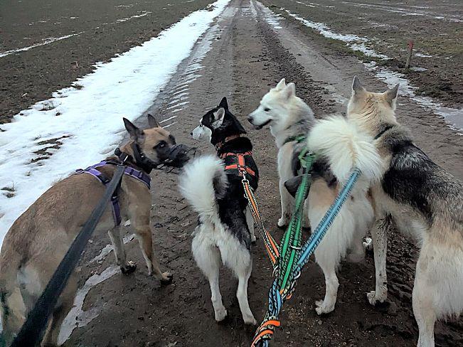 Dies verdeutlicht, dass Maze ein grundsätzlich verträglicher Hund ist, nur in dieser speziellen Gruppenkonstellation kommt es zu Spannungen, die sie psychisch überfordern. In Konfliktmomenten (z. B. bei räumlicher Enge oder hoher Aufregung im Haus) erreicht Maze ein Erregungslevel, in dem sie kurzzeitig nicht mehr ansprechbar ist. Draußen in neutraler Umgebung ignoriert sie fremde Hunde meistens oder zeigt sich bei direktem Kontakt eher unsicher.