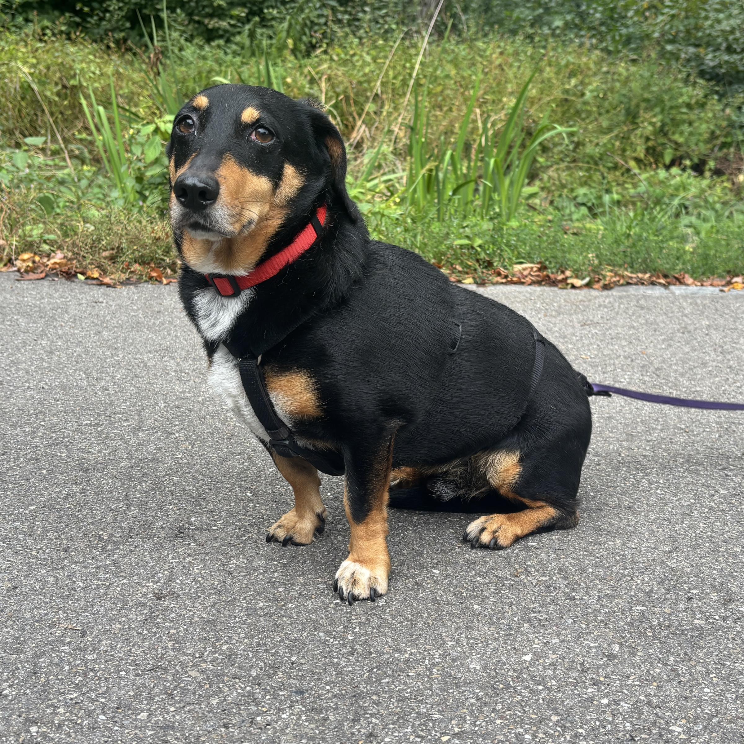 Mex geniesst es spazieren zu gehen, seine Rute und der ganze Körper wackelt dann vor Freude. Er läuft auch super an der Leine. Aktuell fehlt ihm noch etwas Kondition, auch später sollte die Aktivität seinen kurzen Beinen angepasst sein.