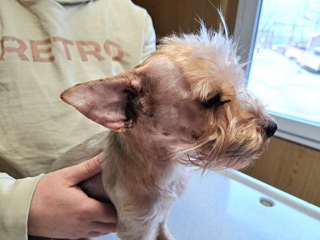 Die arme kleine Maus war in einem total verwahrlosten Zustand. Ihr Fell war verfilzt und voller Flöhe, so dass sie gleich komplett geschoren werden musste. Aber viel schlimmer war die gravierende, beidseitige Ohrentzündung, die der kleinen Hündin große Schmerzen verursacht haben muss und das sicherlich schon eine längere Zeit :-(. Aufgrund der Schwere der Entzündung reichten ein paar Ohrtropfen hier nicht, sondern es war bzw. ist notwendig zu operieren. Bei der ersten, bereits stattgefundenen Operation musste bei diesem Ohr der äußere Gehörgang entfernt werden, um die Paukenhöhle zu eröffnen, was eine hohe Chance auf eine deutliche Verbesserung der Lebensqualität bringt, gleichzeitig aber auch zu Schwerhörigkeit oder sogar Taubheit führt. Die Operation des zweiten Ohres und was hier nötig sein wird steht noch aus…
