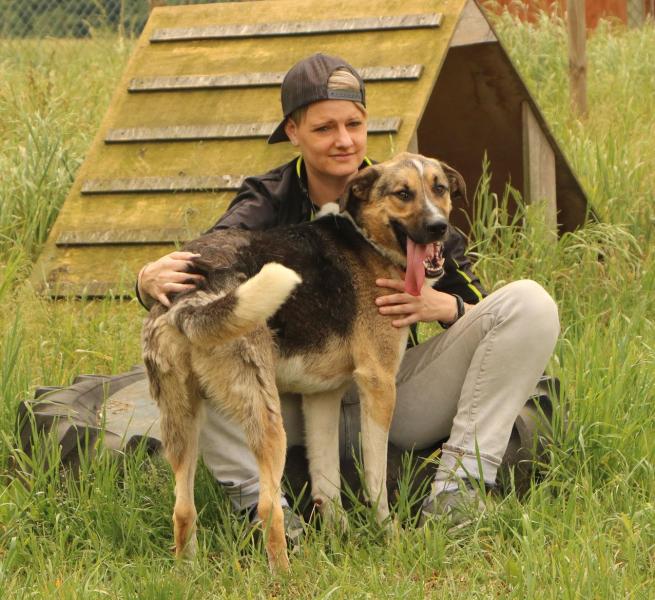 Ausserhalb des Tierheims ist er völlig entspannt, geniesst es total und läuft prima an der Leine. Er hält auch immer schön Kontakt zu seinem Zweibeiner. Bei einem der Häuser trafen sie ein paar Hunde und das war eine ganz freundliche Begegnung. Im Wald sprang dann noch ein Reh vor ihnen auf und davon, aber das interessierte Scooby gar nicht.
