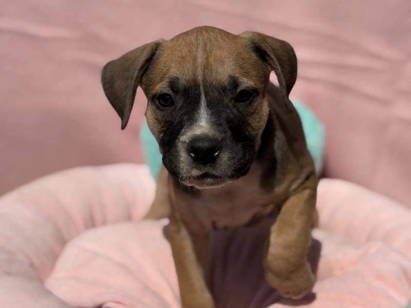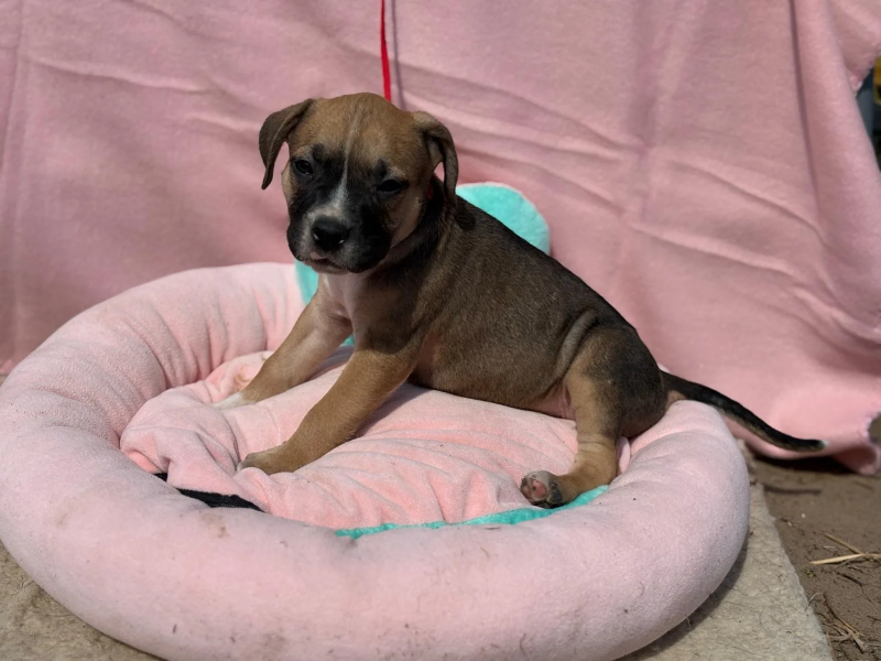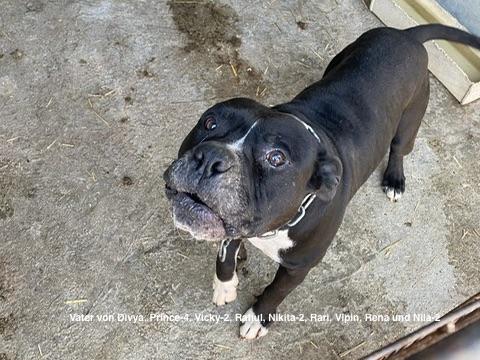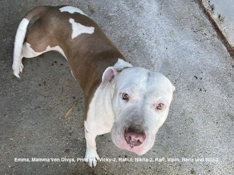 Am 25.5.2025 kam Mama Emma, zusammen mit einem anderen, namenlosen Staffrüden, welcher es leider nicht geschafft hat, aus einem Brennpunktviertel, als Beschlagnahmung ins Tierheim. Man kann sich nur schwer vorstellen, wie die Hunde dort leben mussten und wie mit ihnen umgegangen wurde. Solange das Verfahren läuft, darf «nichts an den Hunden gemacht werden», sprich keine Kastration etc. Zu diesem Zeitpunkt war Emma schon schwanger, wir vermuten von dem inzwischen verstorbenen Staffrüden und gebar am 8.7.2025 9 Welpen, Vipin, Nila, Vicky, Rahul, Nikita, Rari, Divya, Rena und Prince. Nun wurde die Hundefamilie dem Tierheim zugesprochen und wir können sie in die Vermittlung nehmen. Ihnen ist ein trauriges Leben erspart geblieben und sie halten schon Ausschau nach ihren neuen Menschen. Wir drücken ihnen fest die Daumen, dass sie bald ein verantwortungsvolles Zuhause finden.