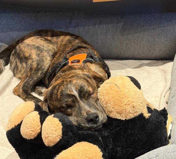 Update Pflegestelle 26.01.26: "Er hat gelernt im Auto zu warten sowie auch kurze Zeit zuhause. Das klappt gut. Sein Leben besteht zurzeit aus Spielen und Fressen. Für Futter tut er so manches! Ein toller Junghund, welcher mit Menschen und Hunden super klarkommt. Was ihn triggert, ist Hundegebell aus der Ferne, welche er nicht einordnen kann. Das macht ihm etwas Angst."