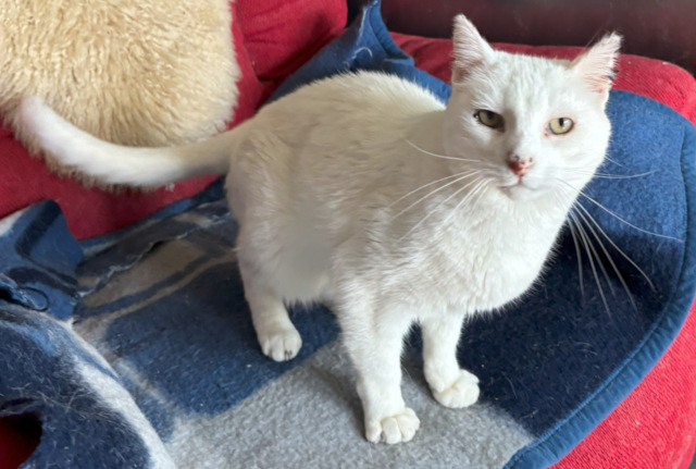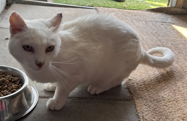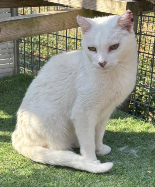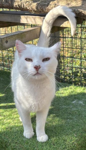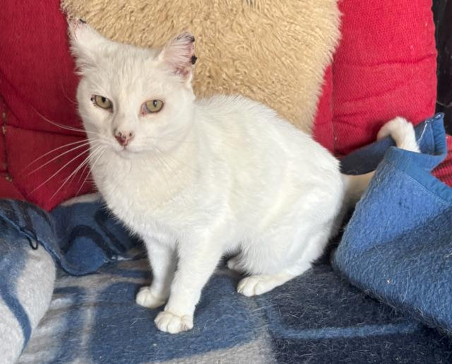 Burrata ist ca. 2020 geboren und ein sehr schöner weißer Kater der im Moment noch im Tierheim in Portugal auf ein Zuhause wartet.