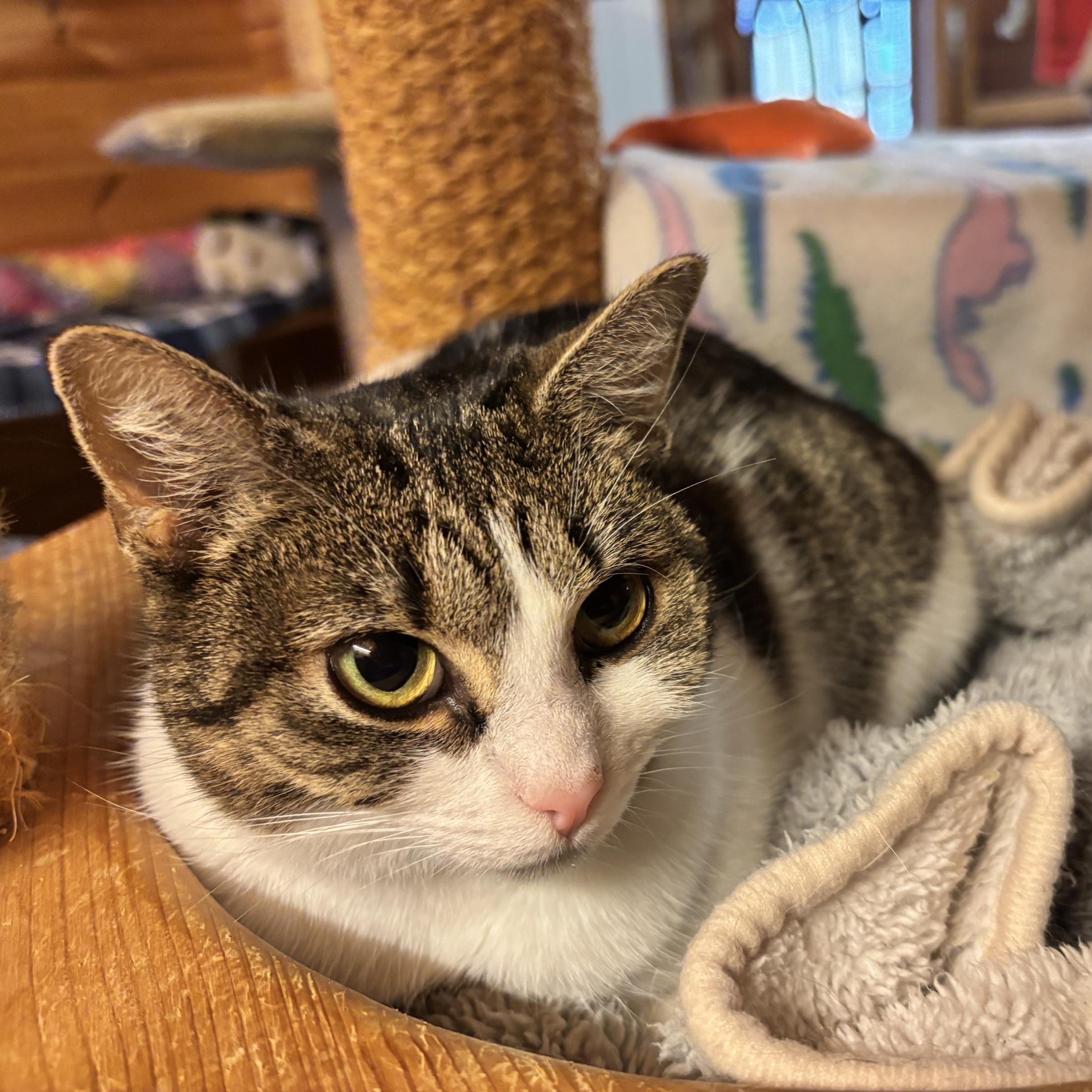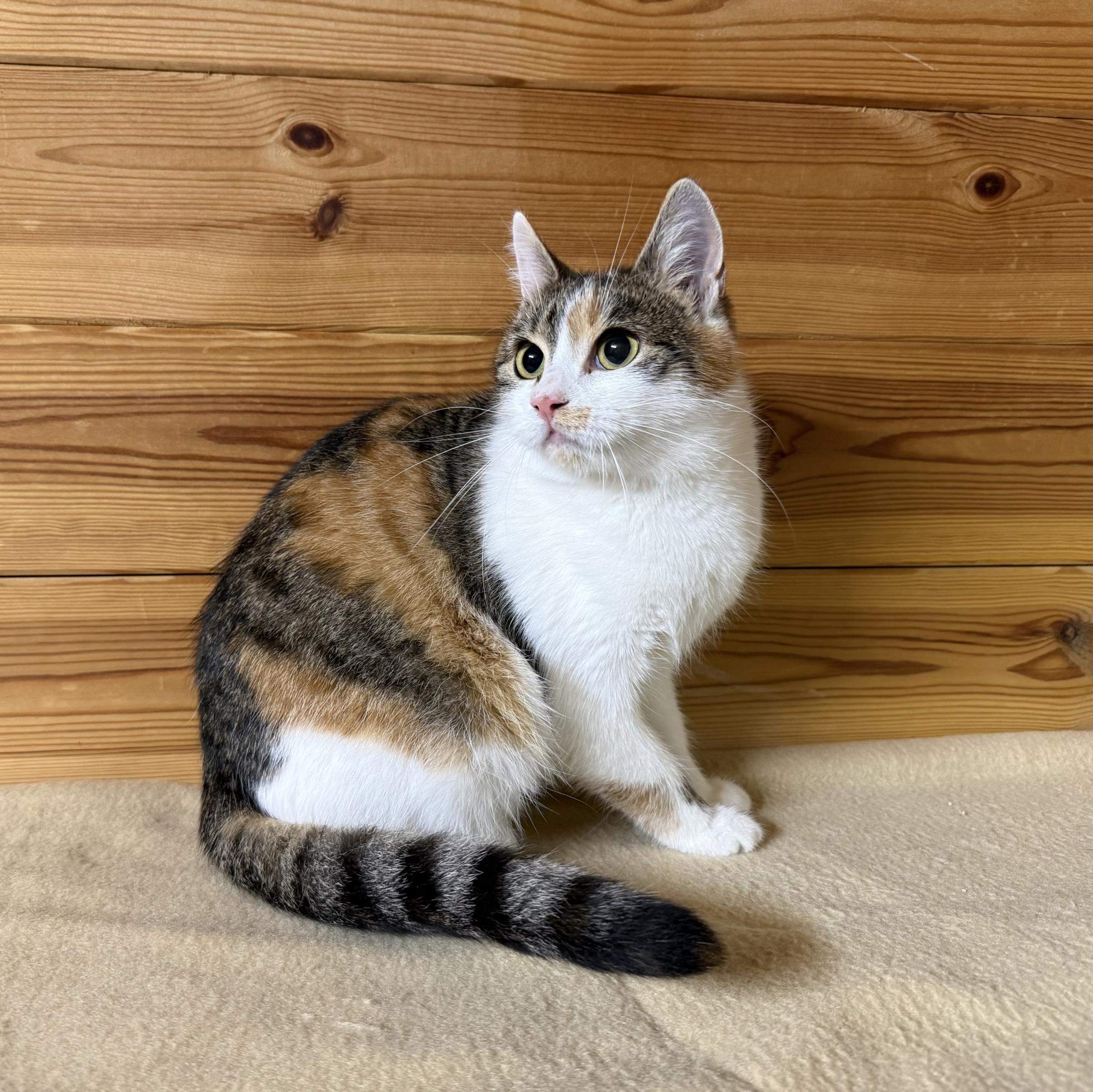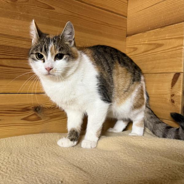 Lori, tiger mit weiss, ist am 1.1.2023 in Ungarn geboren, sie wurde in Ungarn beim Umzug zurückgelassen und bekam dann auf einem Lebenshof Babys welche sie liebevoll aufgezogen hat, alle Babys sind vermittelt. Lori kam am 1.9.2025 über unseren Partnerverein zu uns. Sie ist verschmust und verspielt.