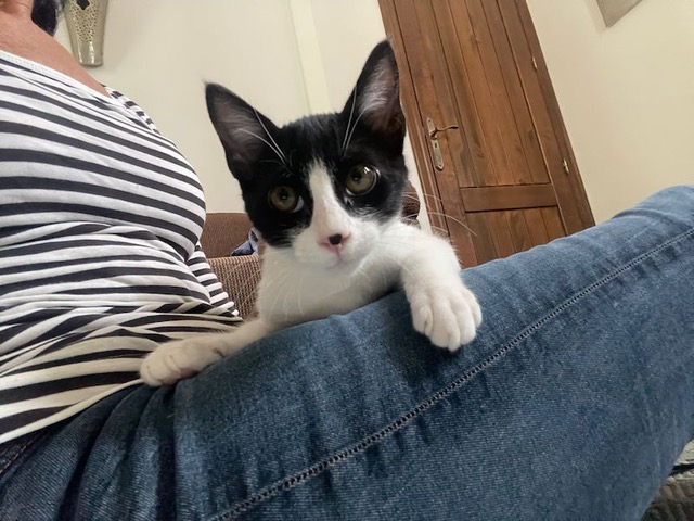 Der schwarz-weisse Spanier George ist ein Wirbelwind, sehr verspielt und tobt mit seinen Katzengspändli durch das ganze Katzenhaus. Er liebt Streicheleinheiten und ist dem Menschen sehr zugetan.