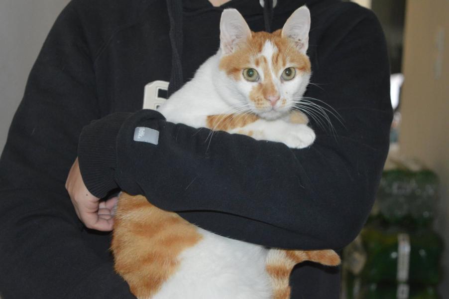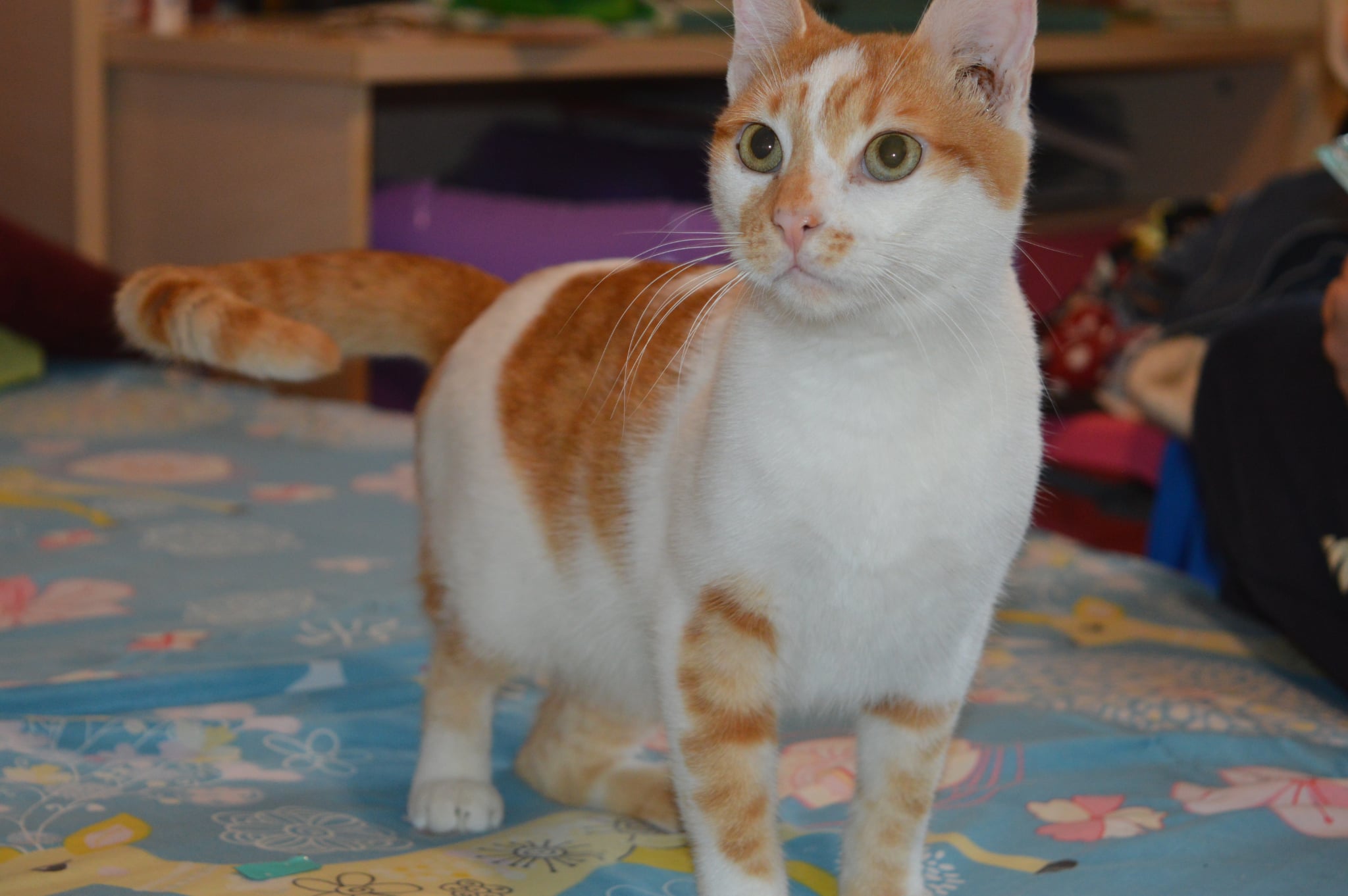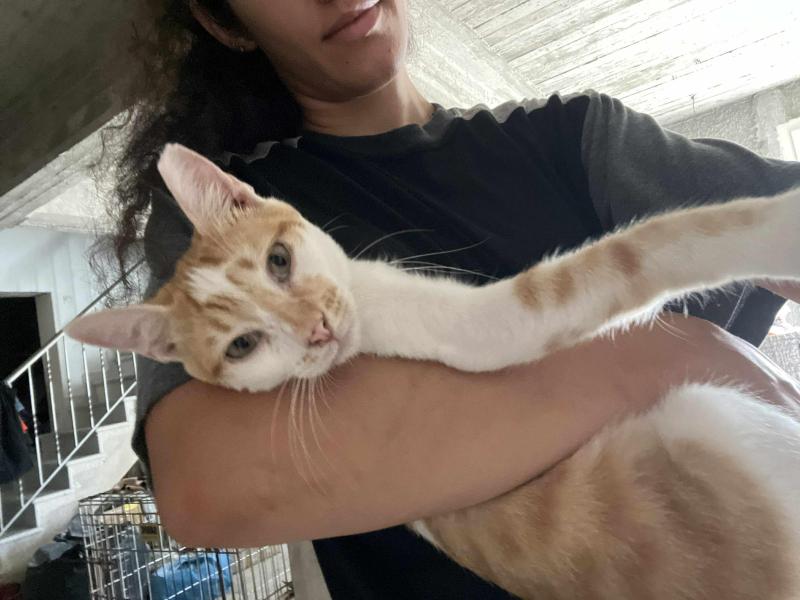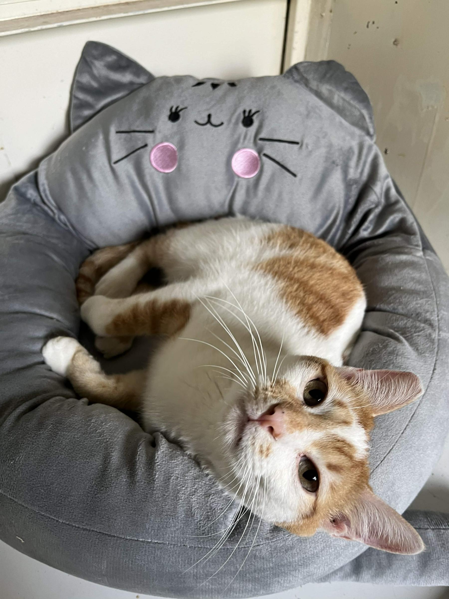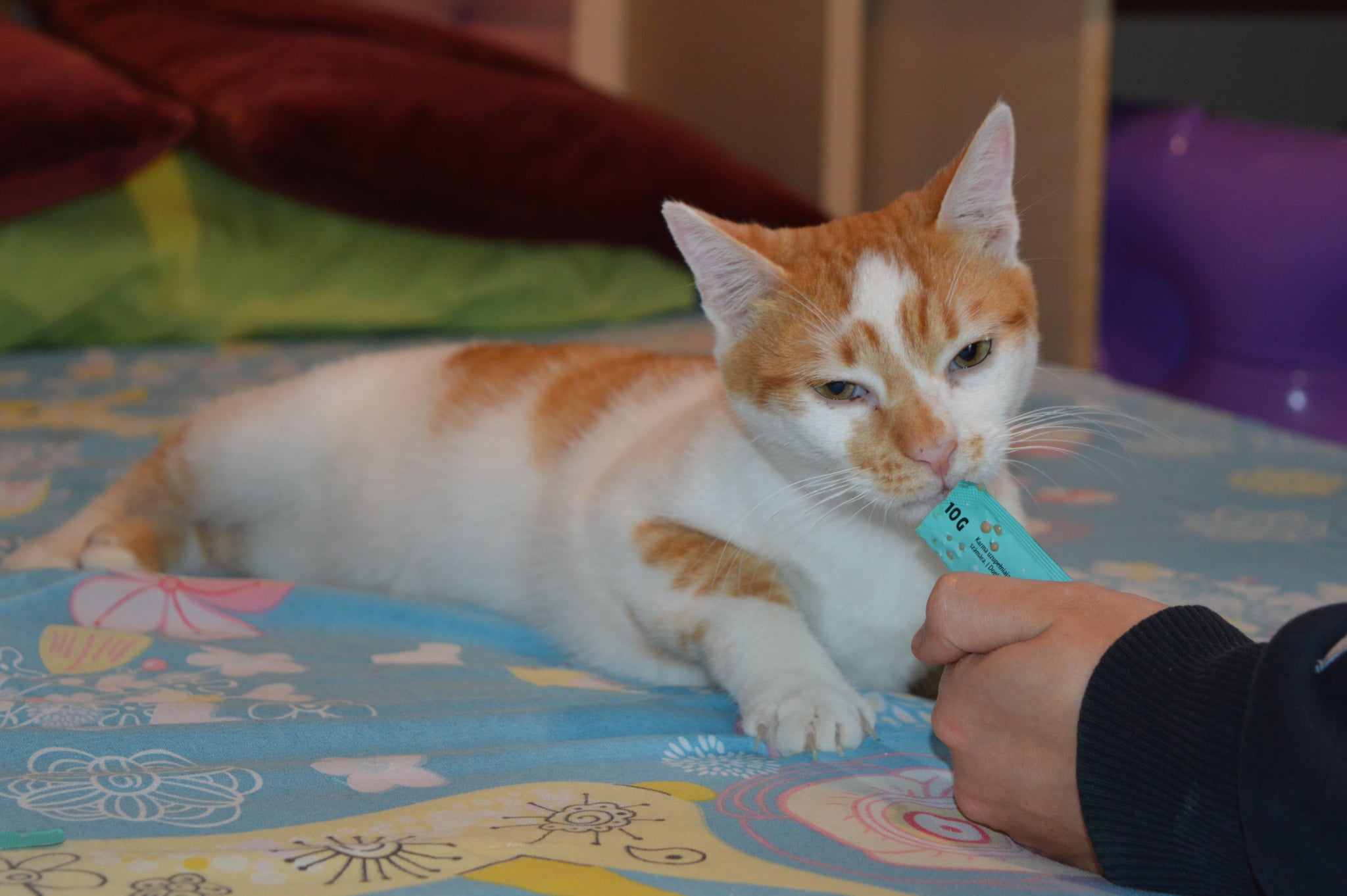 Gordon (rot-weißer Kater) wurde zusammengebrochen am Rand einer stark befahrenen Straße gefunden – zu schwach, um sich zu bewegen, zu erschöpft, um Angst zu haben. Er litt an Katzenschnupfen, war extrem dünn, ausgehungert und hatte starke Schmerzen. Zwei Knochen steckten im Gaumen seines Mundes – ein stilles Leiden, das niemand bemerkt hatte.