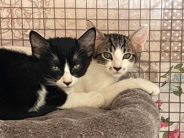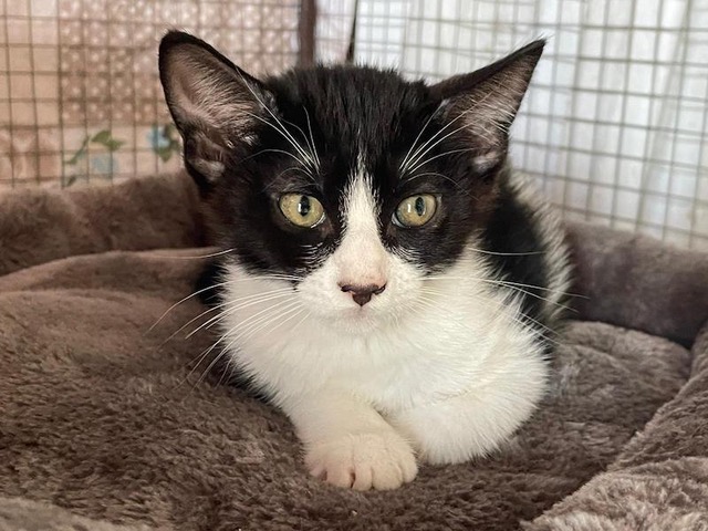 Das schwarz-weisse Katzenkind Hugo wurde mit der Mama und den beiden Geschwisterchen in einer Katzenkolonie gefunden und mit der Falle eingefangen. Nach dem Tierarztbesuch durfte die ganze Familie in die Auffangstation ziehen.