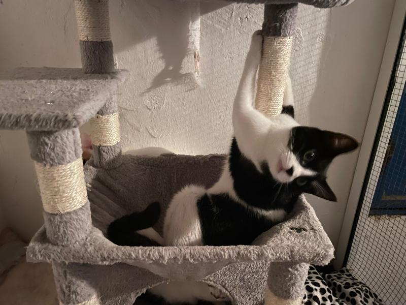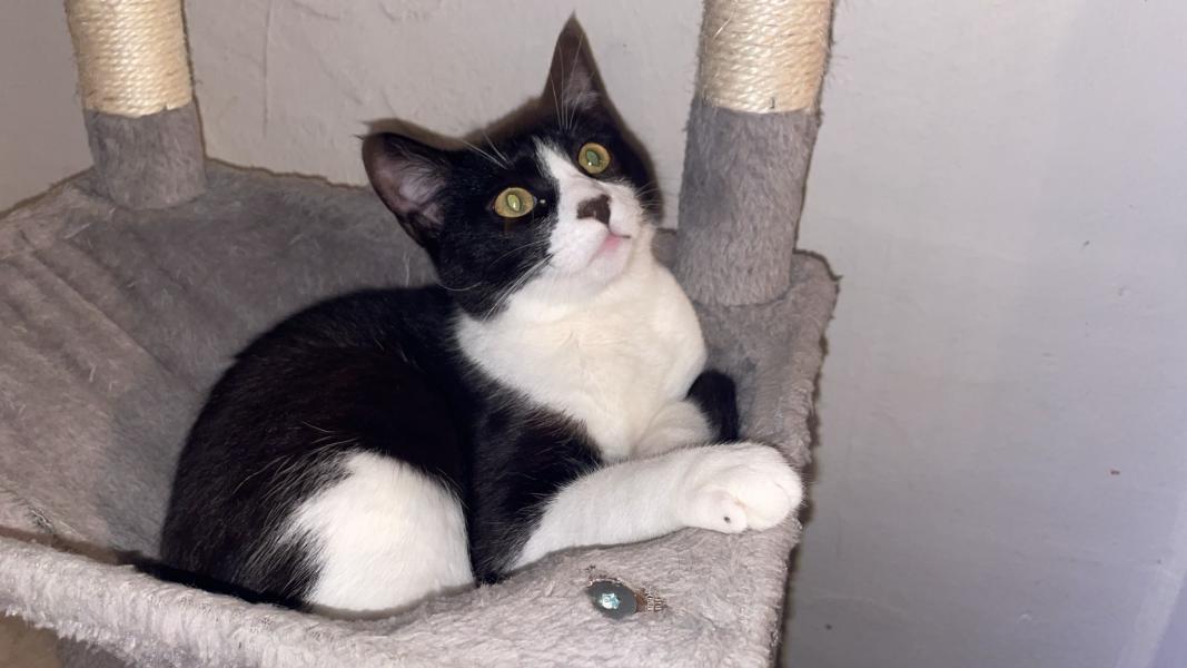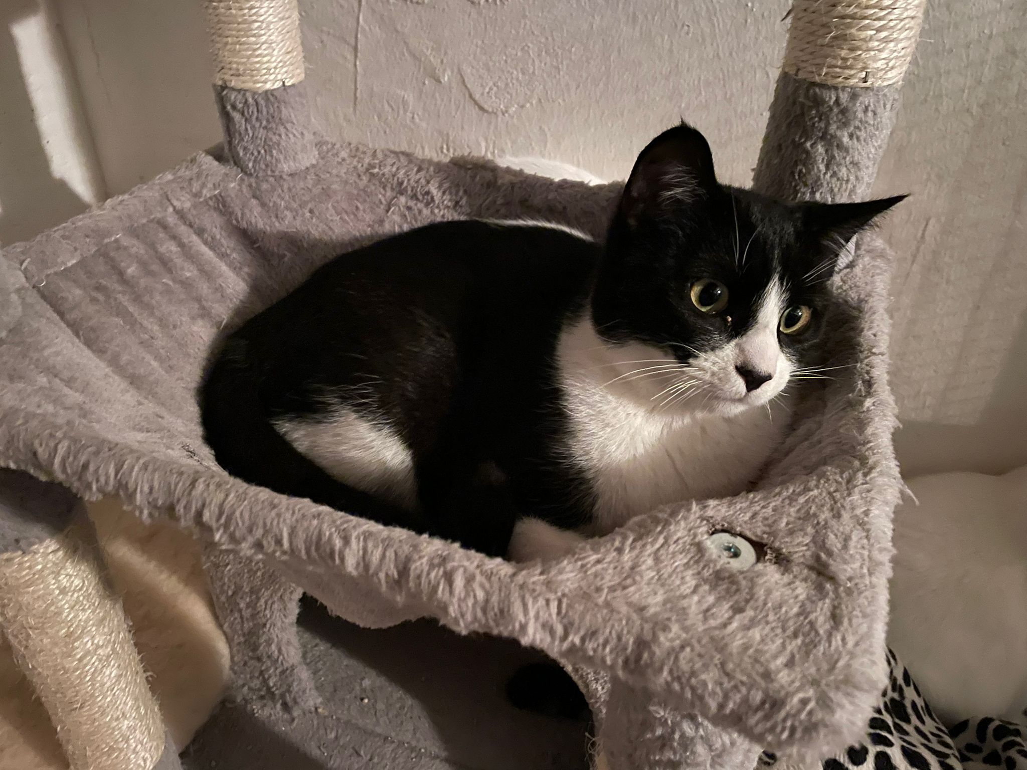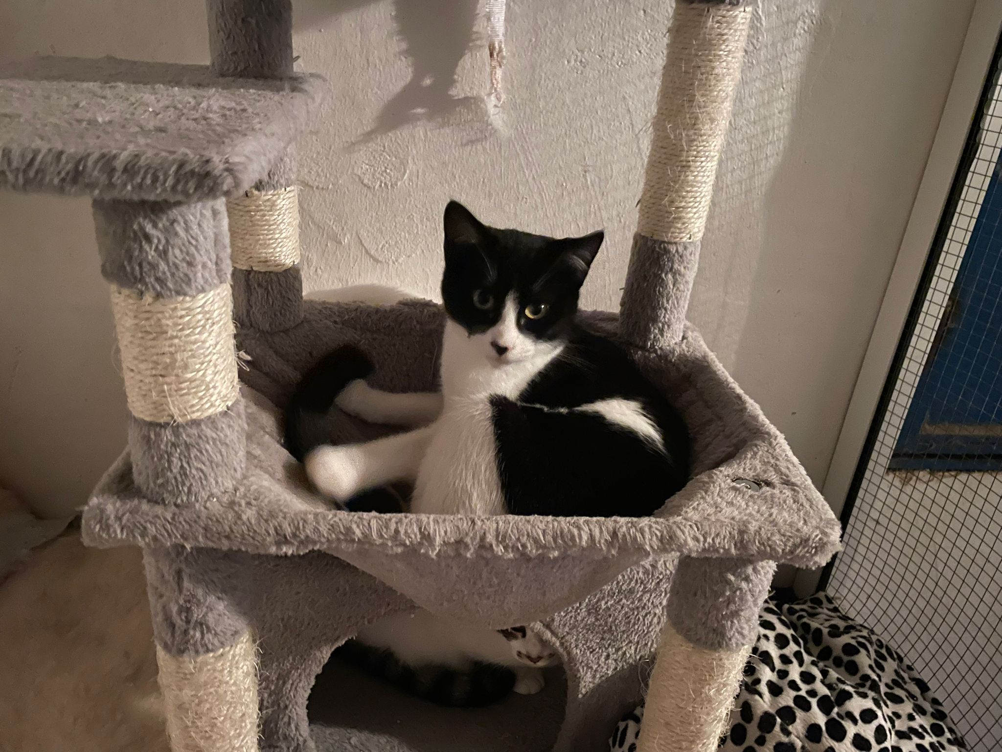Das schwarz-weisse Katzenkind Hugo wurde mit der Mama und den beiden Geschwisterchen in einer Katzenkolonie gefunden und mit der Falle eingefangen. Nach dem Tierarztbesuch durfte die ganze Familie in die Auffangstation ziehen.