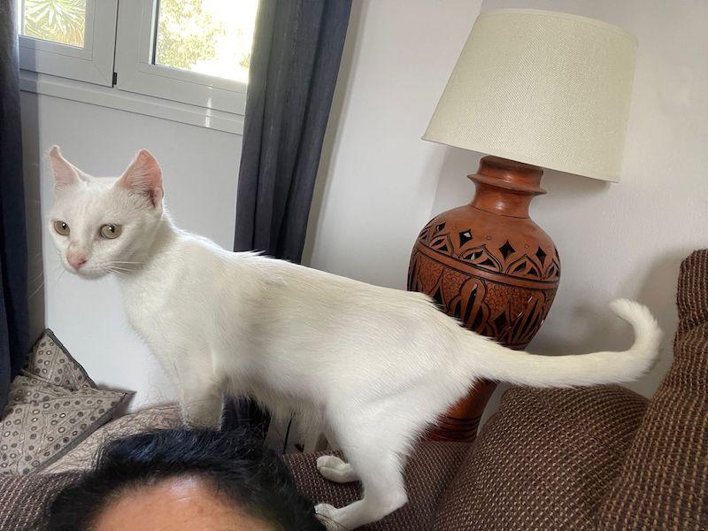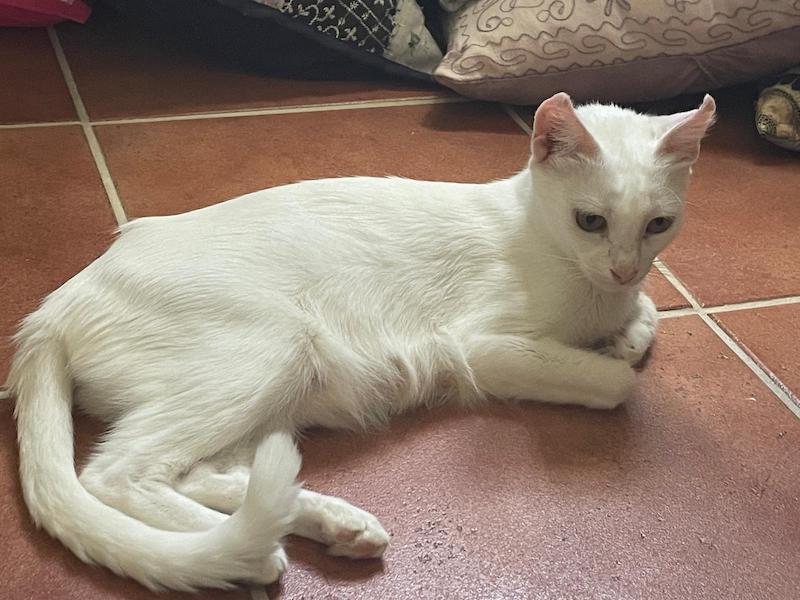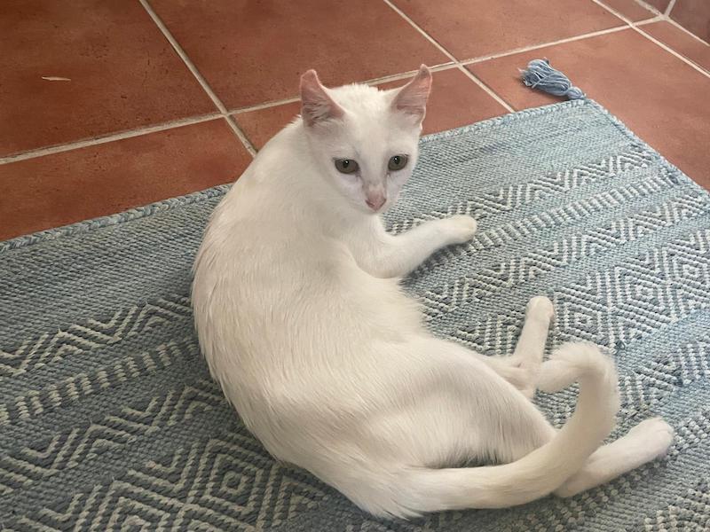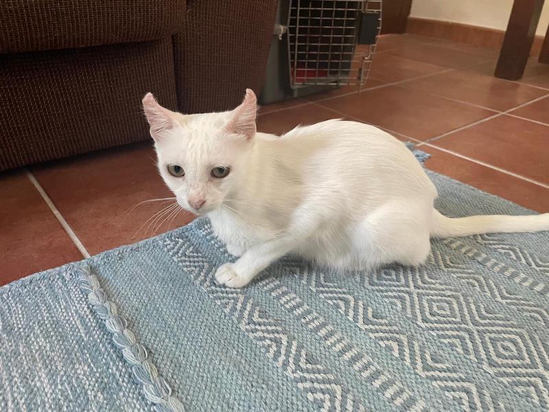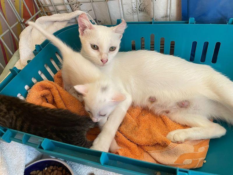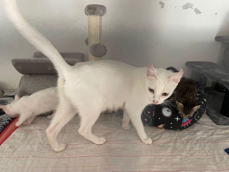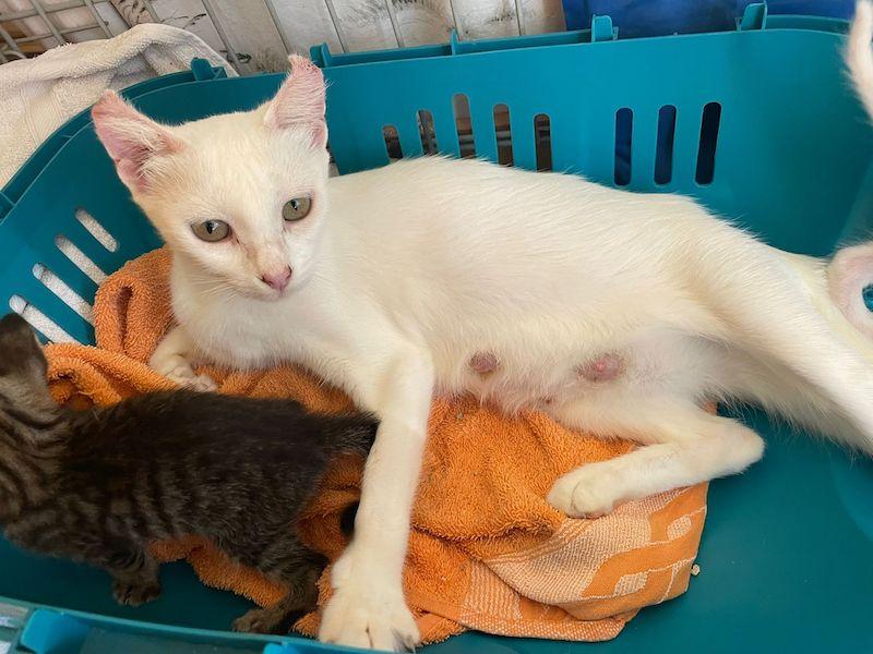 Die schneeweisse Ivy wurde verlassen mit ihren zwei Kitten unter der Autobahnbrücke in einer Katzenkolonie gefunden. Tierschützer brachen dann die kleine Familie in die Auffangstation.