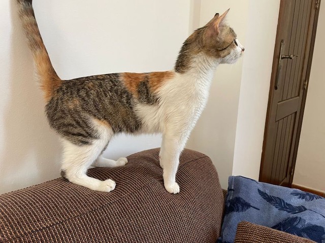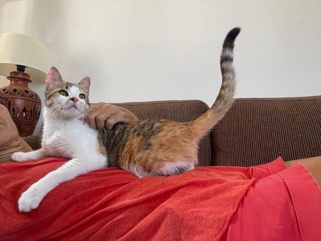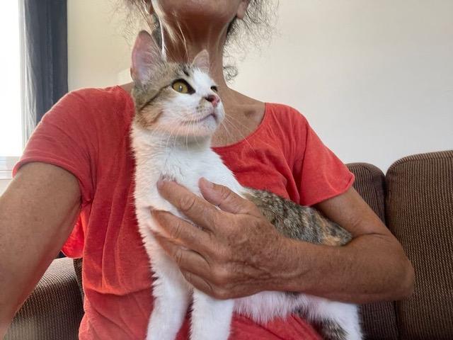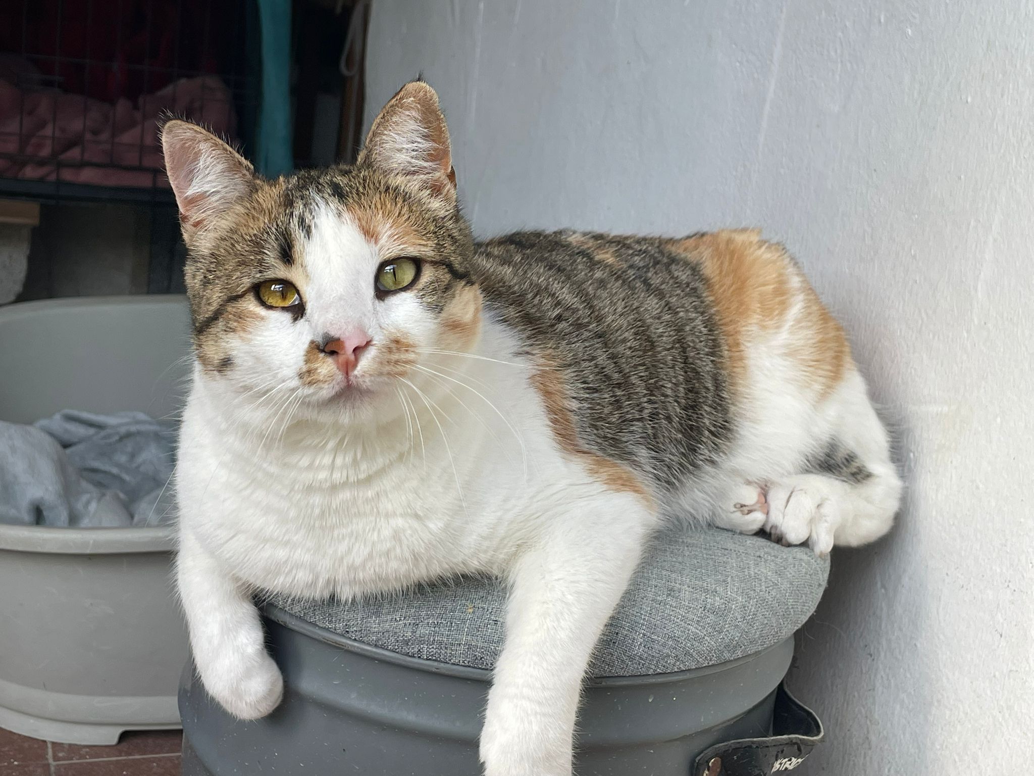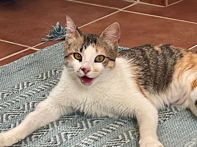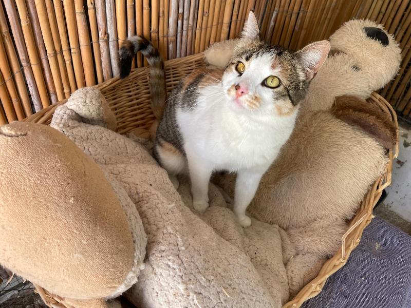 Das hübsche tricolor Katzenmädchen Lea tauchte eines Tages bei einem Landhaus auf und blieb. Da die Besitzer sich nicht richtig um Lea kümmern konnten, brachten sie es in die Auffangstation.