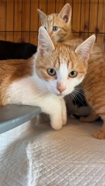 Mango wurde zusammen mit seiner Schwester Peach ausgesetzt und gerettet. Er ist ein verspielter, neugieriger und lieber Katzer.