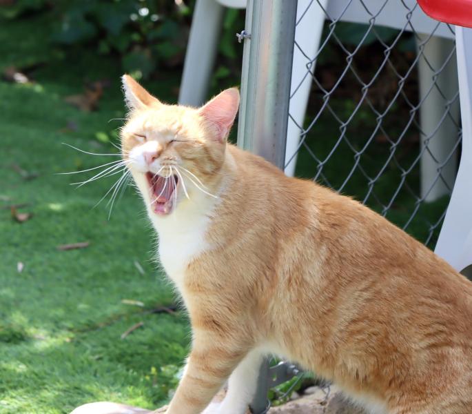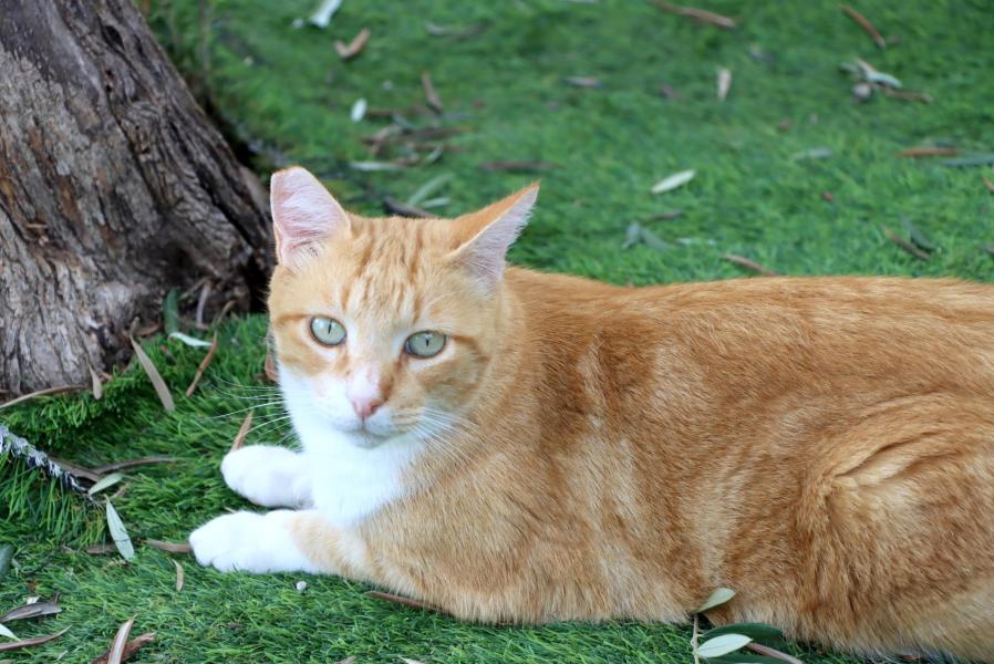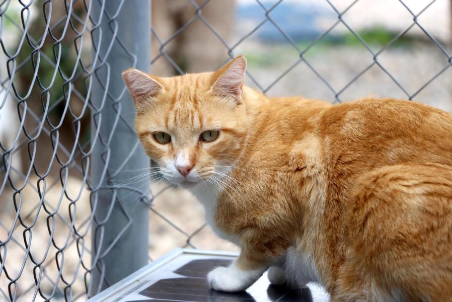 Seit Marco im Katzenauslauf ist, fasst er allmählich mehr Vertrauen. An den ersten Tagen versteckte er sich noch hinter einer Katzenhütte, doch inzwischen fühlt er sich deutlich wohler. Wir haben ihn schon dabei beobachtet, wie er mit Tigre und Lluna auf den Baum kletterte.