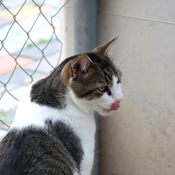 In den ersten Tagen in der Quarantäne des Tierheims war Michi sehr ängstlich und wollte sich nicht anfassen lassen. Doch eines Tages kam der Junge, der ihn aufgezogen hatte, ins Tierheim. Ohne Probleme konnte er Michi aus dem Gehege heben, auf den Arm nehmen und streicheln. Er zeigte den Pflegern, wie man ihn am besten hält, damit er sich sicher fühlt. Um Michi die Zeit in der Quarantäne angenehmer zu gestalten, setzte man ihm Marco, einen anderen Kater, als Gesellschaft ins Gehege. Die beiden verstanden sich auf Anhieb und sind bis heute unzertrennlich.