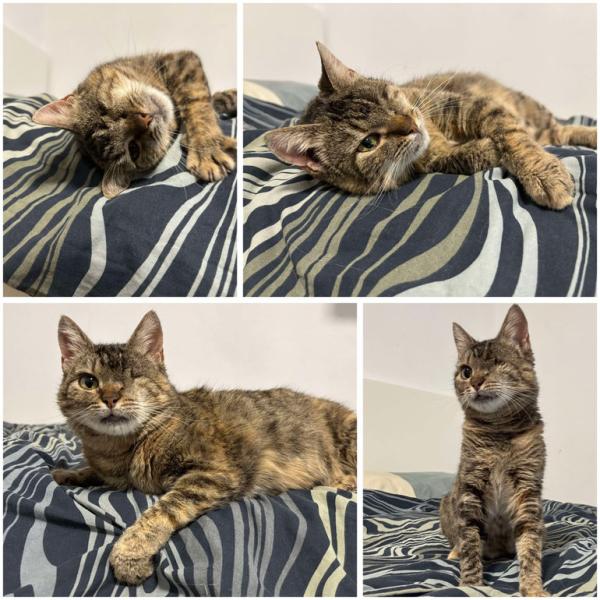 Die hübsche Numa wurde vor dem Büro der Tierschutzpolizei ausgesetzt. Ihr Gesundheitszustand war sehr schlecht und ein Auge musste in der Tierklinik entfernt werden. Nach ihrer Genesung durfte sie in die Auffangstation der Pfotenhilfe Mogli ziehen.