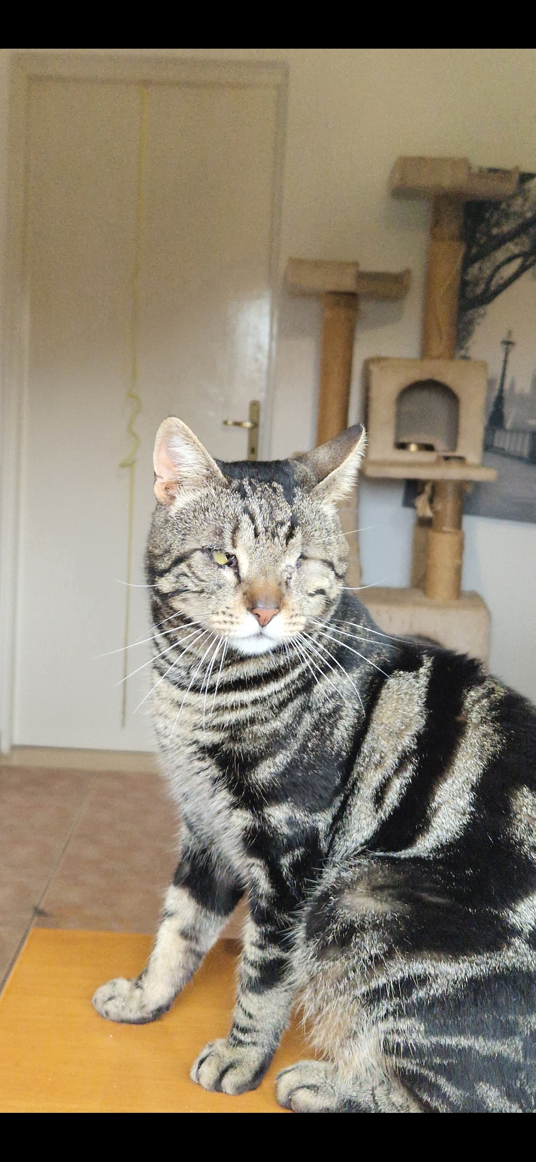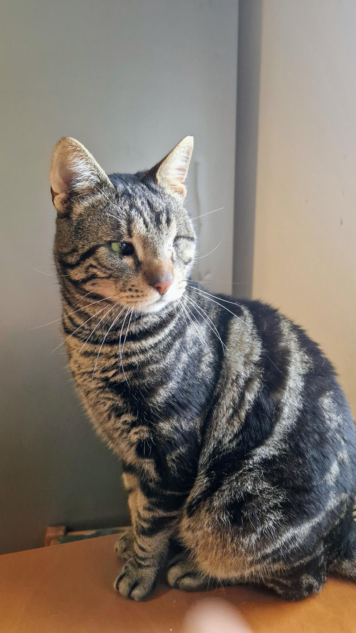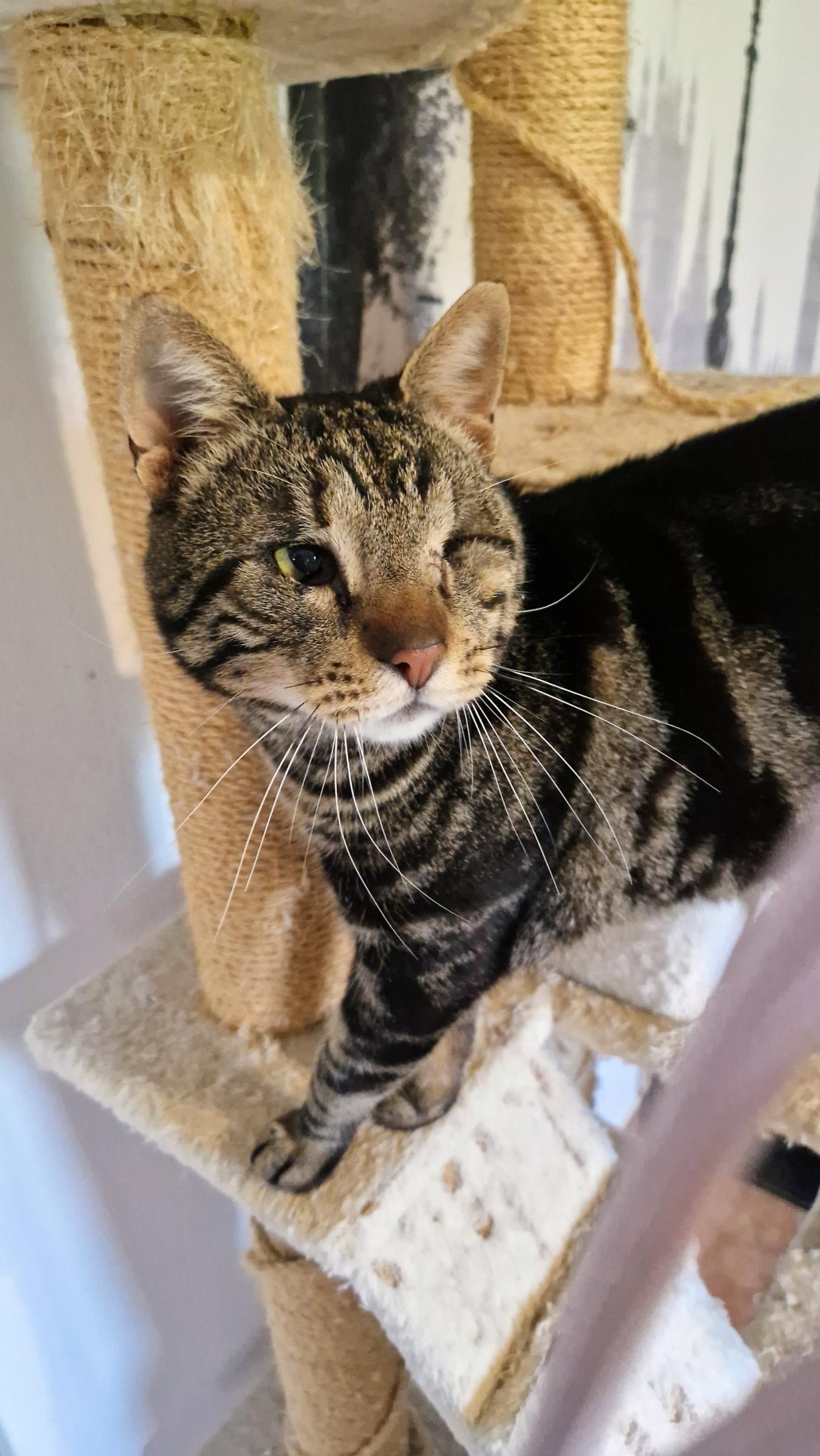 Er ist eine großartige, wundervolle Katze – sicher, geliebt und endlich gesehen. Er hat ein Auge.