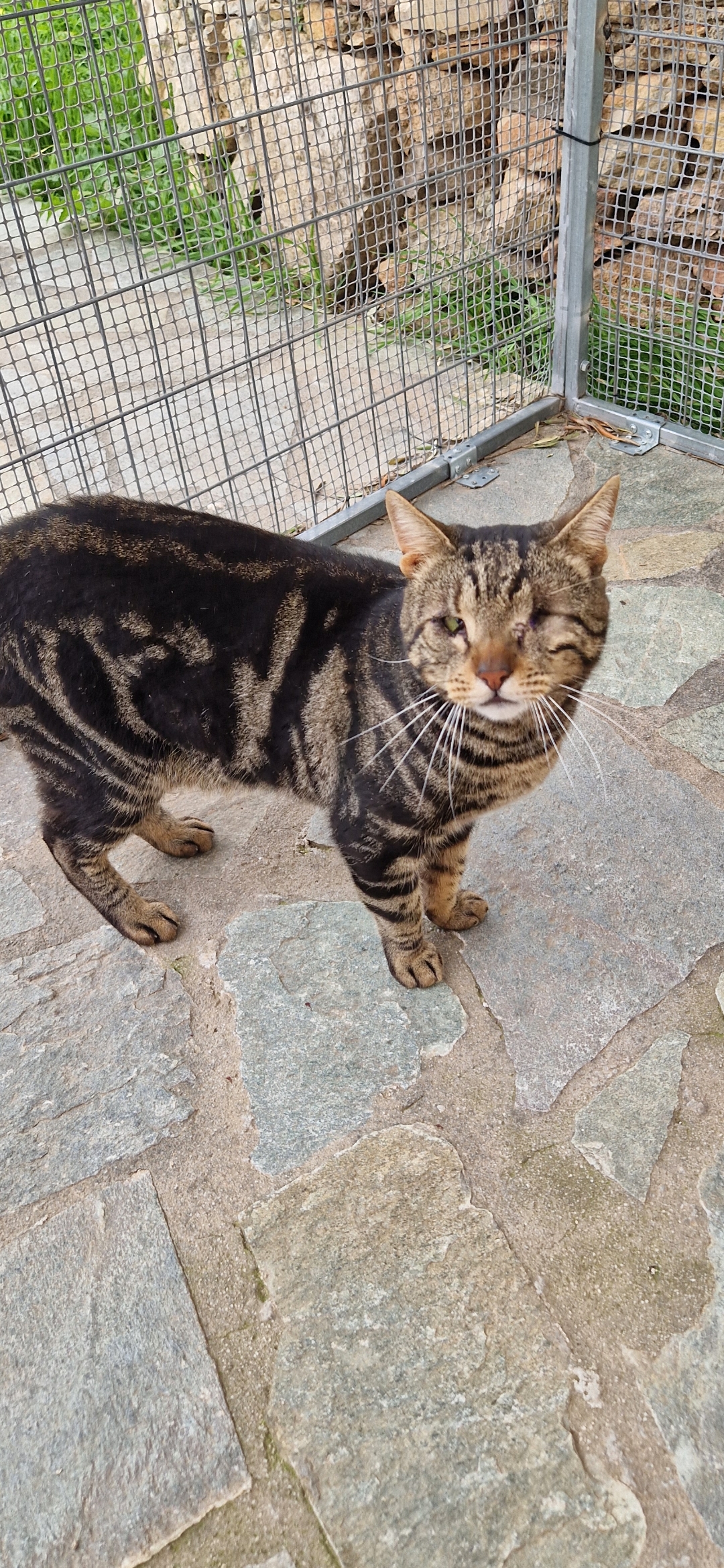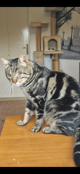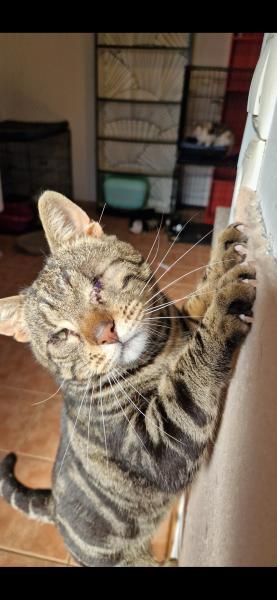 Er hat eine erfolgreiche Operation am Auge wegen Entropium hinter sich, und sein anderes Auge wurde sorgfältig vernäht. Er erholt sich prächtig. Vollständig geimpft, gechippt und bald auf FIV/FelV getestet – bereit für sein endgültiges Zuhause.