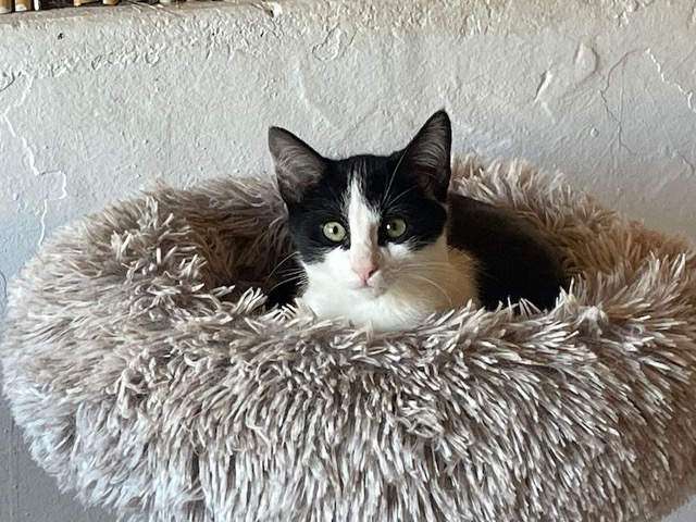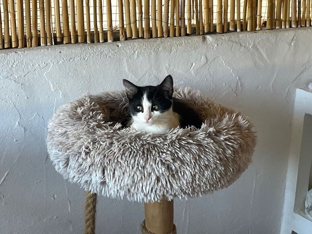 Der hübsche schwarz-weisse Spanier Suerte ist ein freundliches Katerchen, das seine Gspändli sehr liebt. Mit ihnen tollt er durch das ganze Katzenhaus, kuschelt gerne und spielt für sein Leben gerne. Er liebt Streicheleinheiten und ist dem Menschen zugetan.
