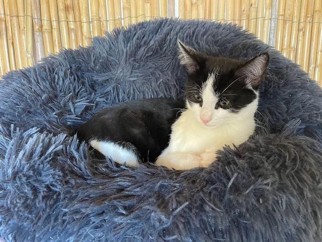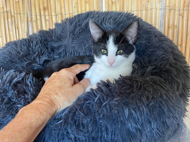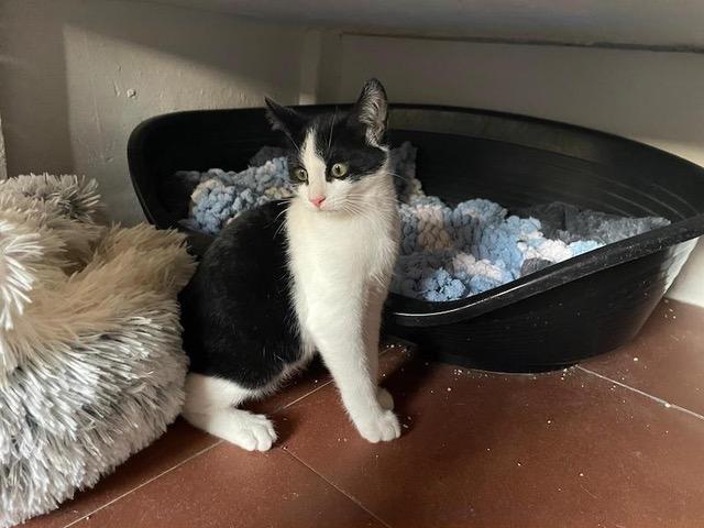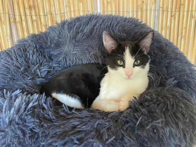 Der hübsche schwarz-weisse Spanier Suerte ist ein freundliches Katerchen, das seine Gspändli sehr liebt. Mit ihnen tollt er durch das ganze Katzenhaus, kuschelt gerne und spielt für sein Leben gerne. Er liebt Streicheleinheiten und ist dem Menschen zugetan.