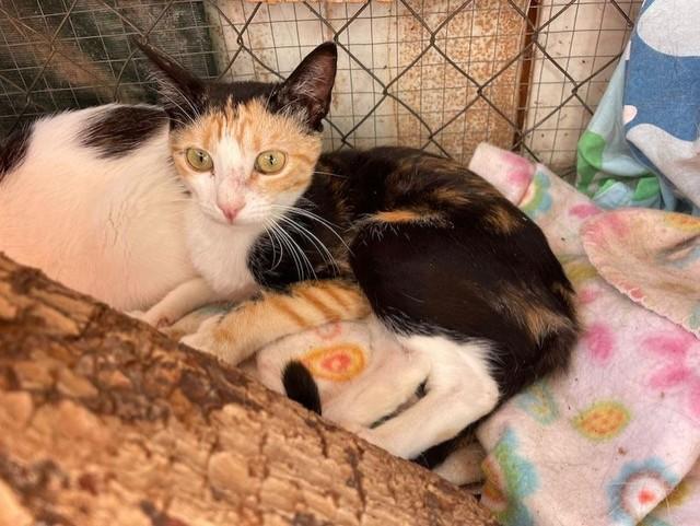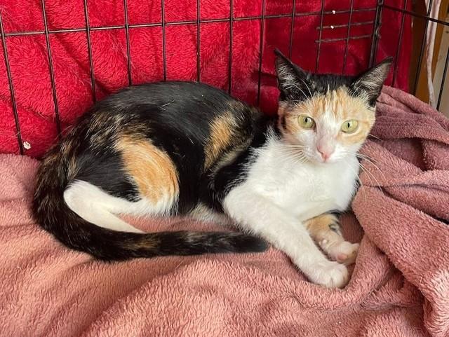 Das hübsche Tricolor Katzenmädchen Trixie wurde völlig eingeschüchtert in einer Katzenkolonie gefunden. Tierschützer nahmen es mit und brachten Trixie in die Auffangstation.