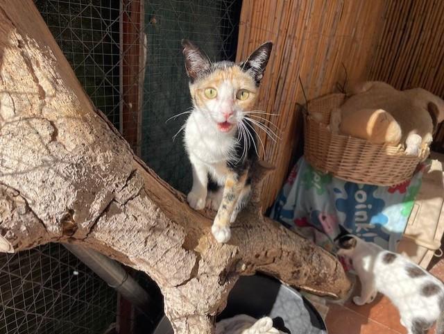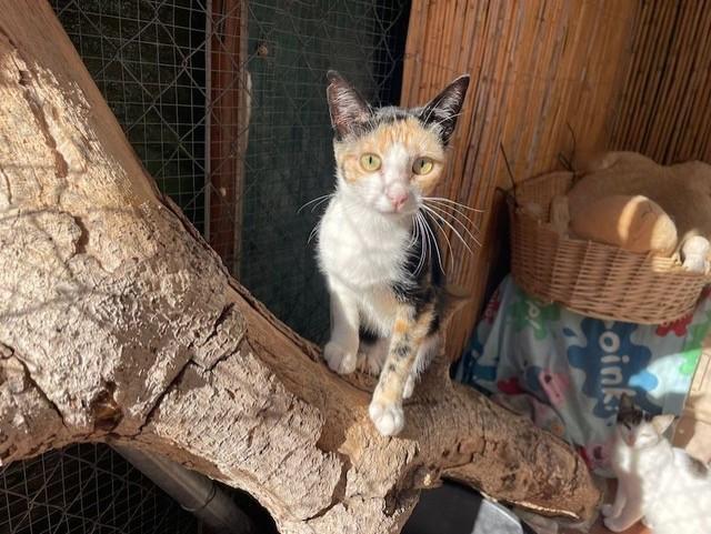 Kleine tricolore Katze Trixie wartet auf ihr Happy End