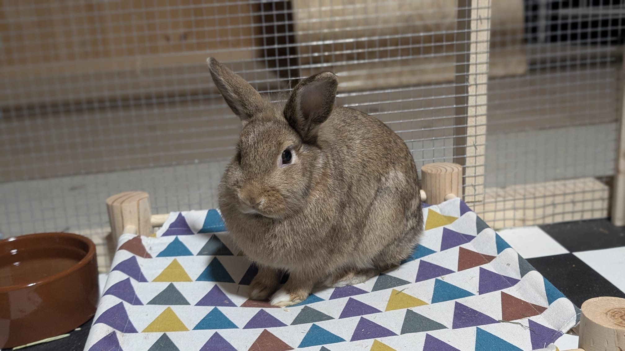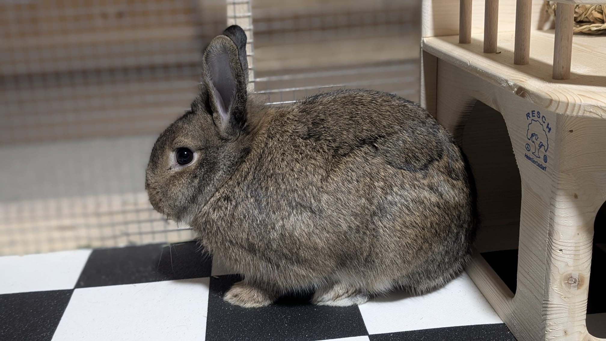 Das zweite Zwergkaninchen heisst Leah und sie ist die Mutigste der Bande. Nichts bringt sie schnell aus der Ruhe, wenn sie ganz gemütlich ihre Karotte frisst.