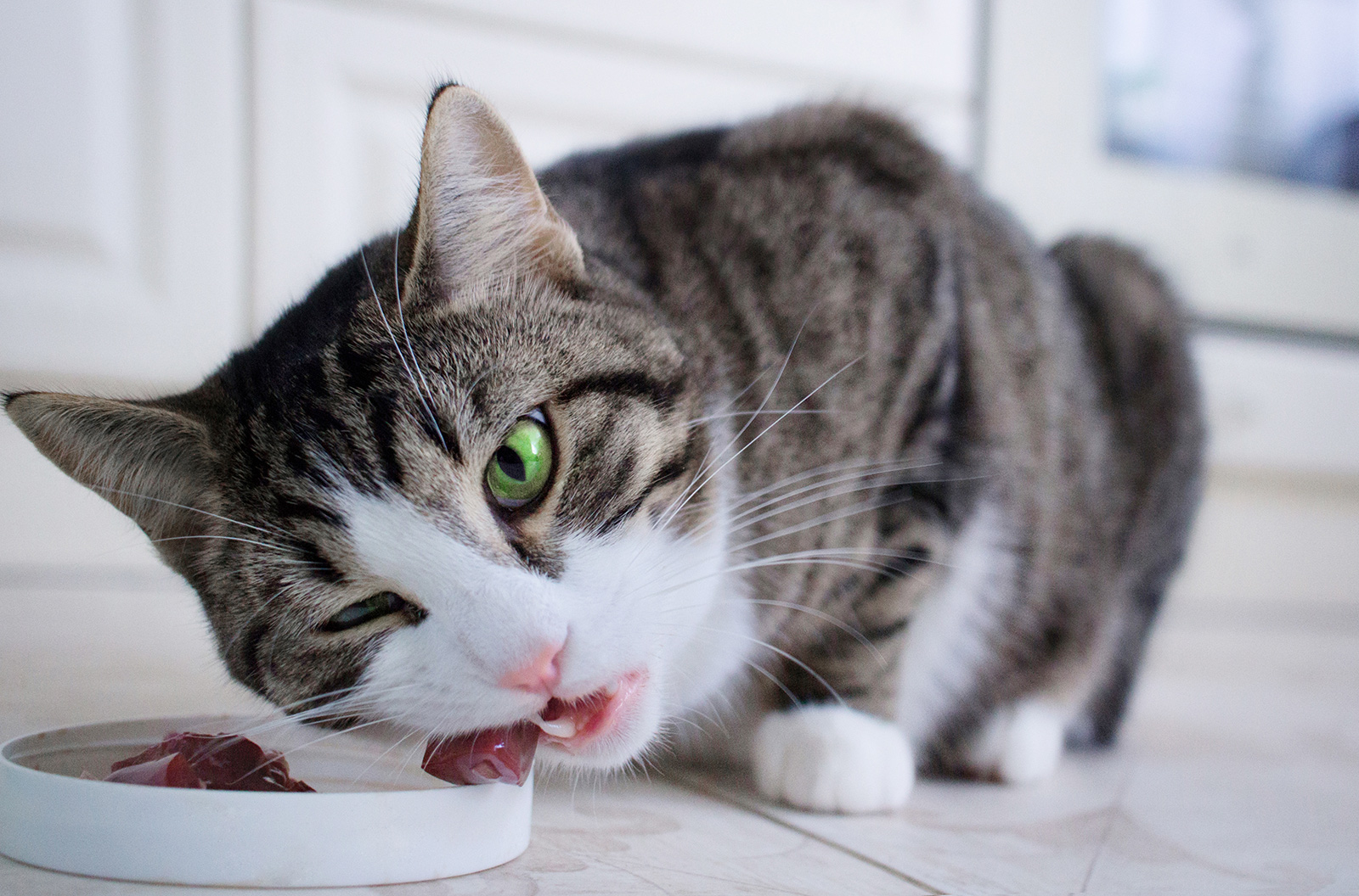 Fleischstücke können nicht als Ganzes verschluckt werden, daher eignen sie sich dazu, die Katze zum Kauen zu bewegen.
